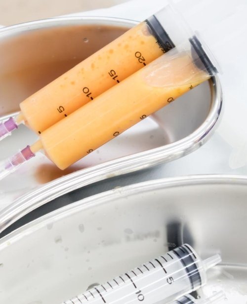 Depending on the procedure, a small sample of blood or fat is collected for processing.